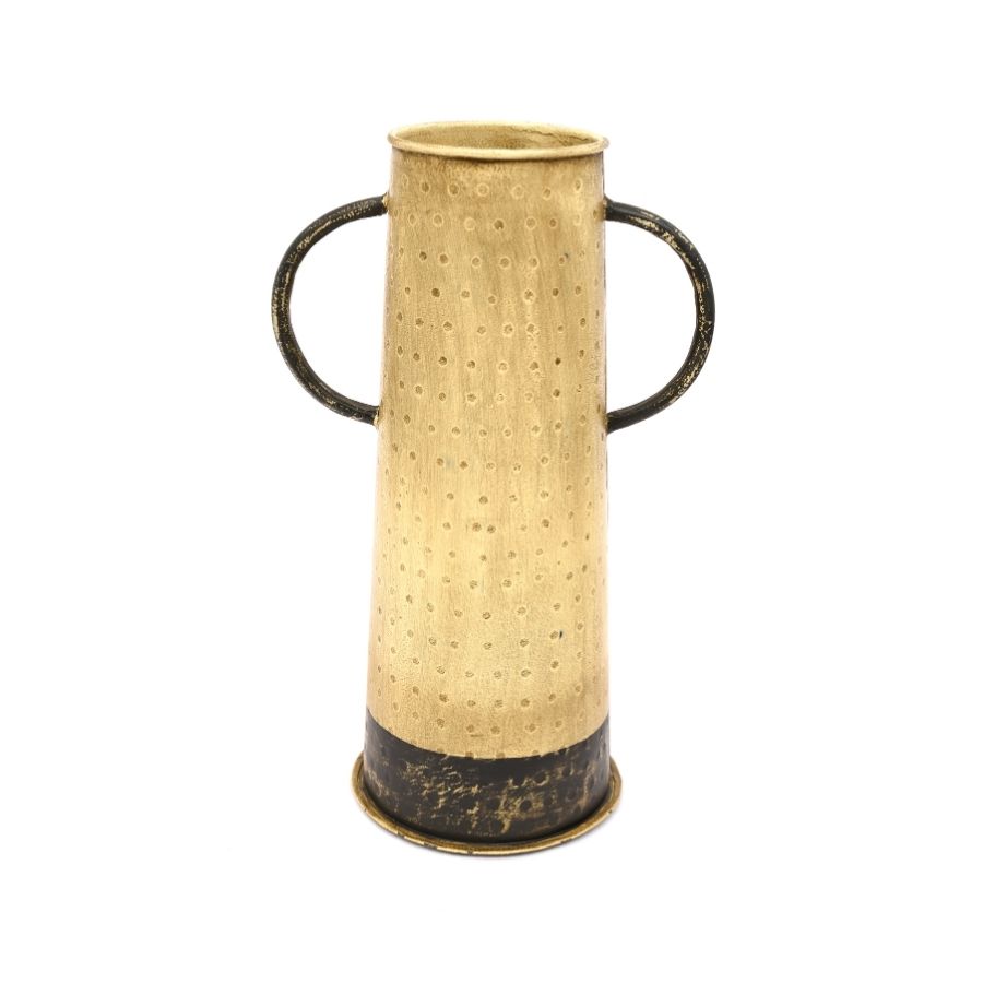 Enhance interiors with this set of handcrafted decorative metal vases, designed in a tall cylindrical shape with side handles for a rustic yet elegant appeal. Finished in a brushed antique brass tone with a darkened base, these vases exude vintage charm and complement a variety of décor styles.