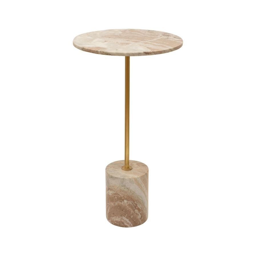 Bring a touch of sophisticated luxury to your lounge area with this exquisite pink marble drink table. Designed with a slender, minimalist silhouette, this piece features a circular tabletop and a substantial cylindrical base, both crafted from premium marble with stunning natural rose and tan veining. The two marble elements are seamlessly connected by a sleek gold-finished metal stem, creating a refined contrast between organic stone and polished metallic accents. Its compact footprint makes it the perfect companion for a plush armchair or a stylish addition to a small entertaining space.