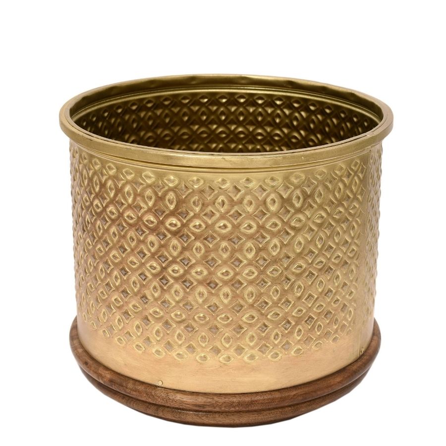 Embossed Metal Planter Set with Wooden Base β Antique Brass Finish