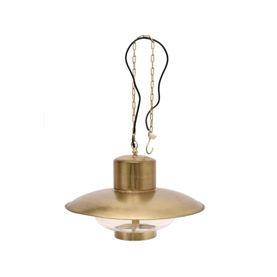 This stylish hanging pendant lamp features a sleek gold metal shade paired with a clear glass diffuser for balanced and elegant illumination. Suspended from a sturdy chain, it provides both functional lighting and decorative appeal. Ideal for dining areas, kitchens, living rooms, or entryways, this pendant lamp adds a refined touch to modern and contemporary interiors.