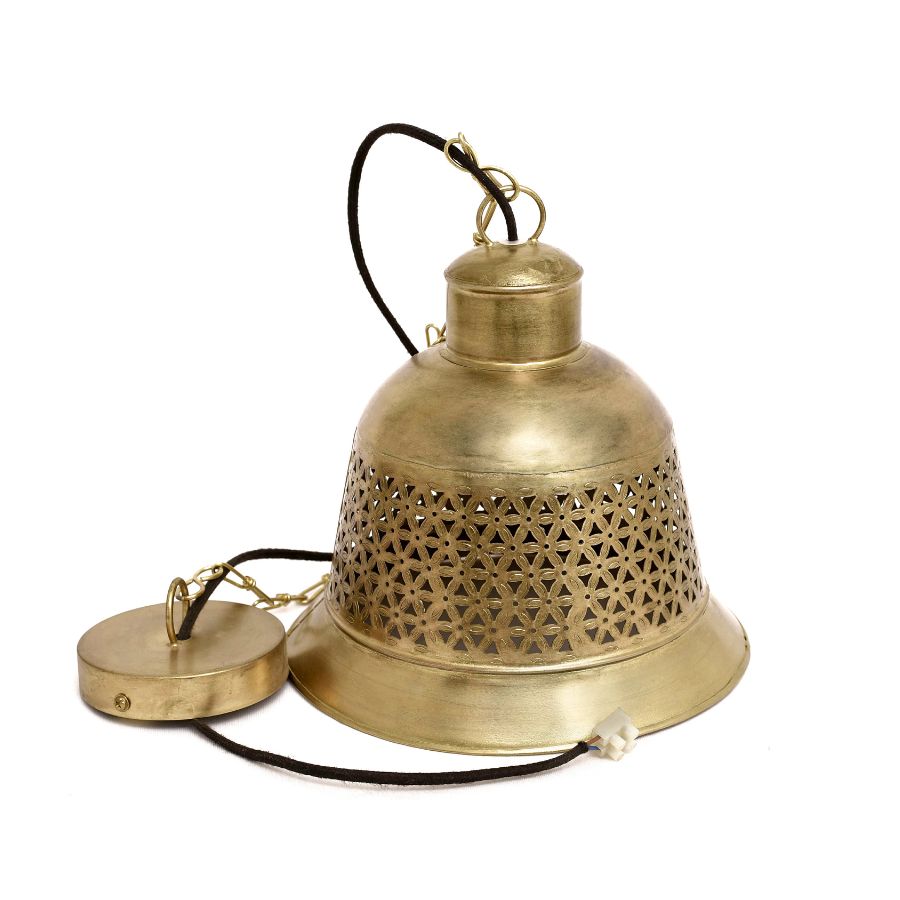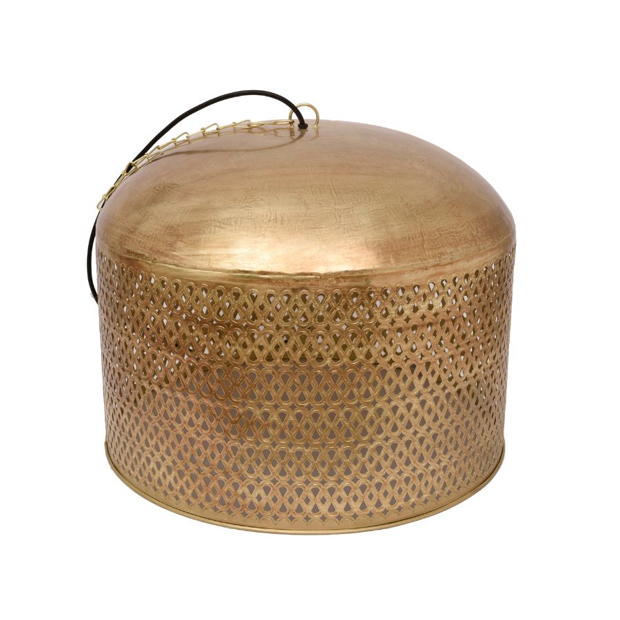This elegant hanging pendant lamp features a cylindrical metal shade with a refined perforated pattern, finished in a warm gold tone. Designed to create soft ambient lighting with subtle decorative shadows, it enhances the atmosphere of any space. Ideal for dining areas, living rooms, cafés, or accent corners, this pendant lamp combines modern style with artisanal craftsmanship.