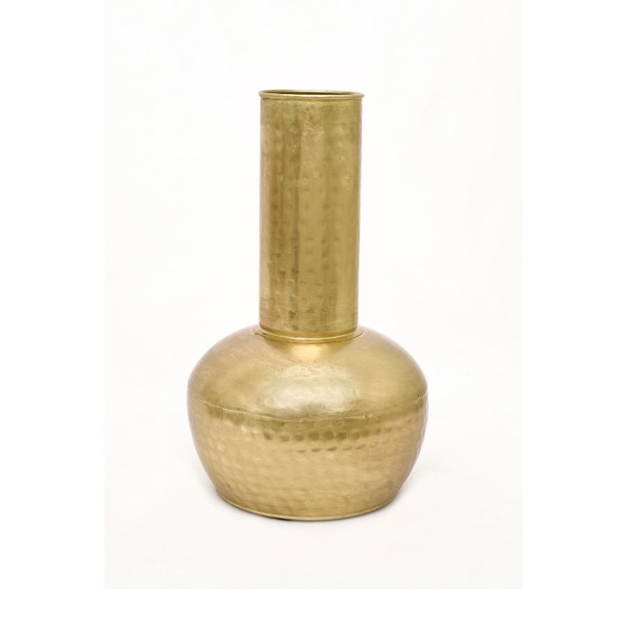 Enhance interiors with this set of handcrafted hammered metal vases, designed with a golden antique finish. Featuring a bulbous base and a tall cylindrical neck, these vases combine traditional craftsmanship with modern elegance. The hammered texture adds depth and artisanal charm, making them ideal as decorative statement pieces.