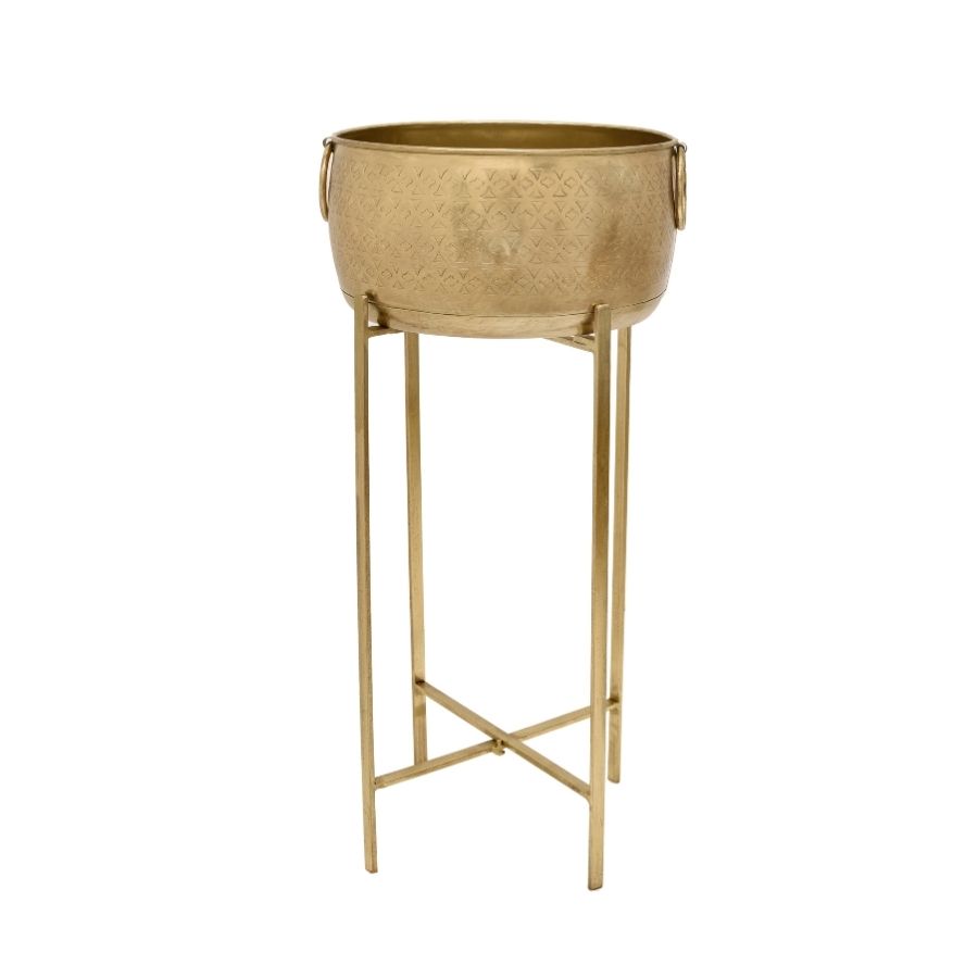 Add a luxurious touch to your dΓ©cor collection with this set of handcrafted metal planters on sleek stands. Finished in an elegant antique brass tone with subtle engraved patterns, these planters are perfect for showcasing indoor plants, artificial greenery, or as standalone decorative accents.