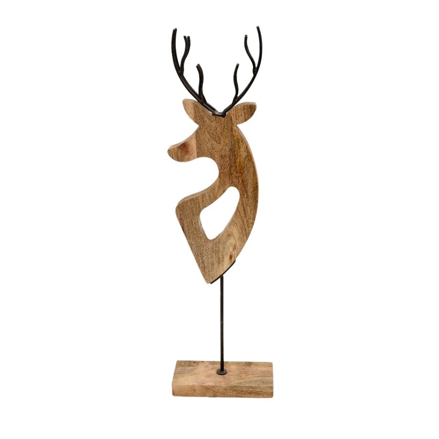 This handcrafted wooden and metal reindeer figurine combines rustic charm with modern design, making it a unique addition to any dΓ©cor collection. Featuring a natural wood body with an artistic cut-out design, supported by sleek black metal legs and antlers, it creates a stylish and contemporary look. Mounted on a solid wooden base, this reindeer is both decorative and durable β perfect for festive displays as well as year-round dΓ©cor.