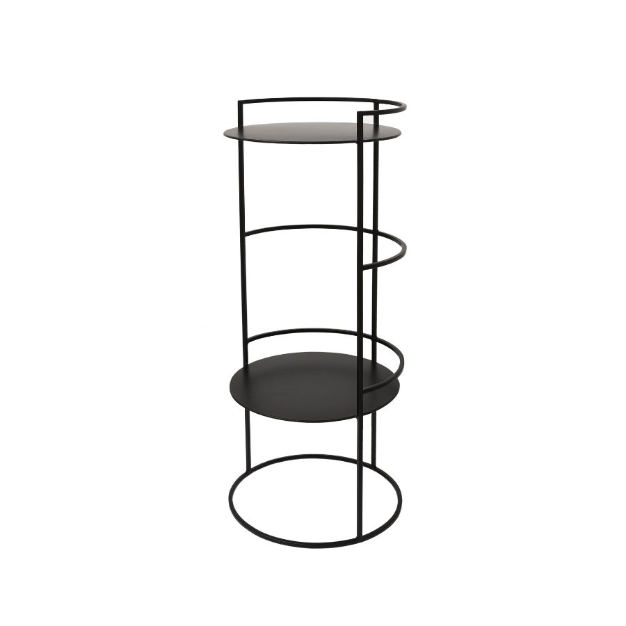 This sleek two-tier side table showcases a minimalist round design crafted entirely from black metal. Its open-frame structure and circular shelves offer functional storage while maintaining a light, contemporary look. Ideal as a side table, accent table, or compact display piece for modern interiors.