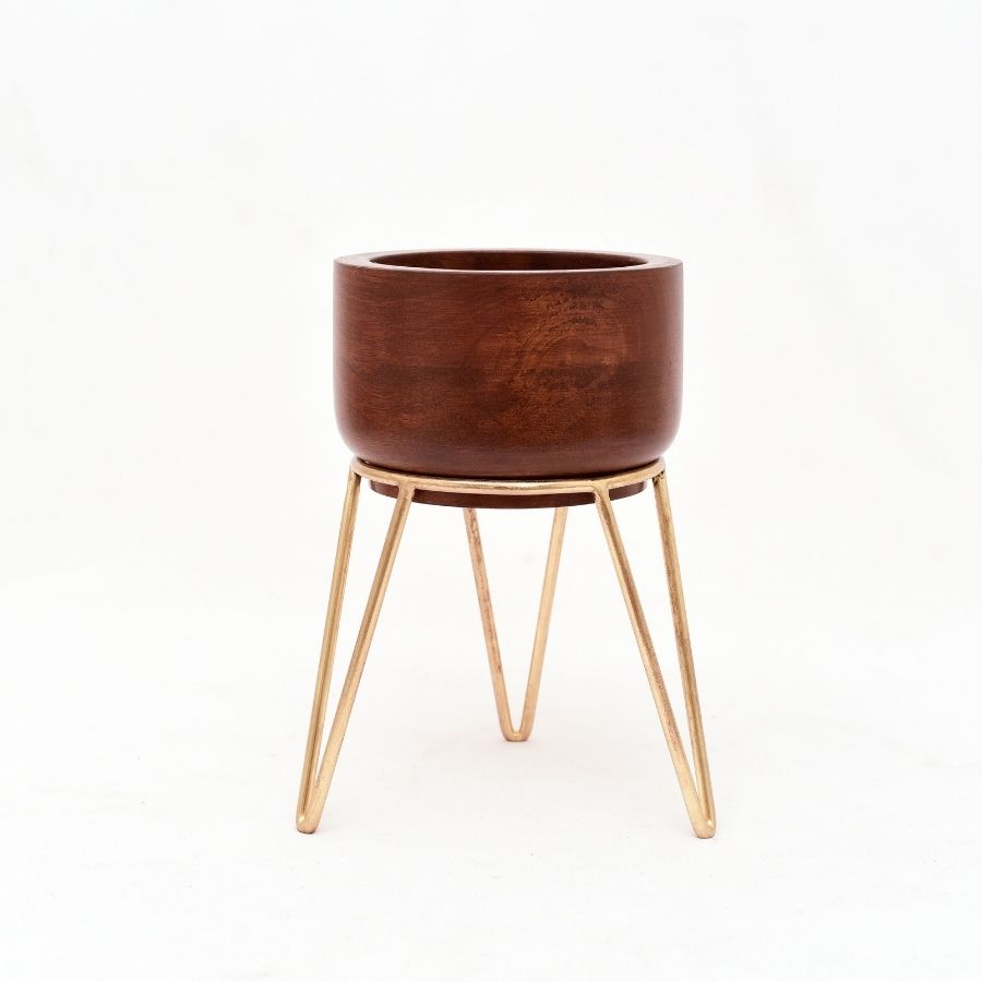Add timeless elegance to interiors with this set of handcrafted wooden planters on metal stands, designed to blend natural charm with modern design. Made from premium quality wood, these planters feature a smooth polished finish with rich wood grains, paired with sleek metallic stands in a minimalist geometric design.