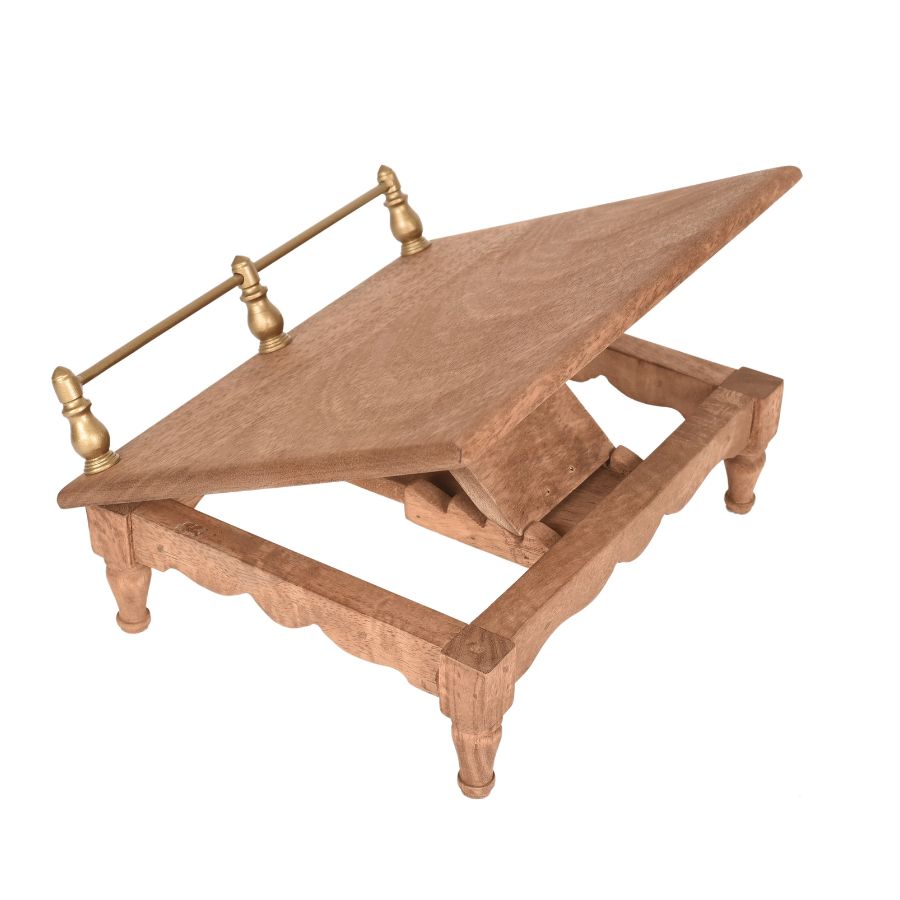 This handcrafted wooden bajot (chowki) is designed with a smooth polished wooden surface and traditional turned legs, enhanced with a decorative brass rail on the front. Known for its durability and cultural appeal, this multipurpose chowki is widely used for religious rituals, décor displays, serving, and gifting purposes. The elegant fusion of natural wood and brass detailing gives it a premium traditional look.