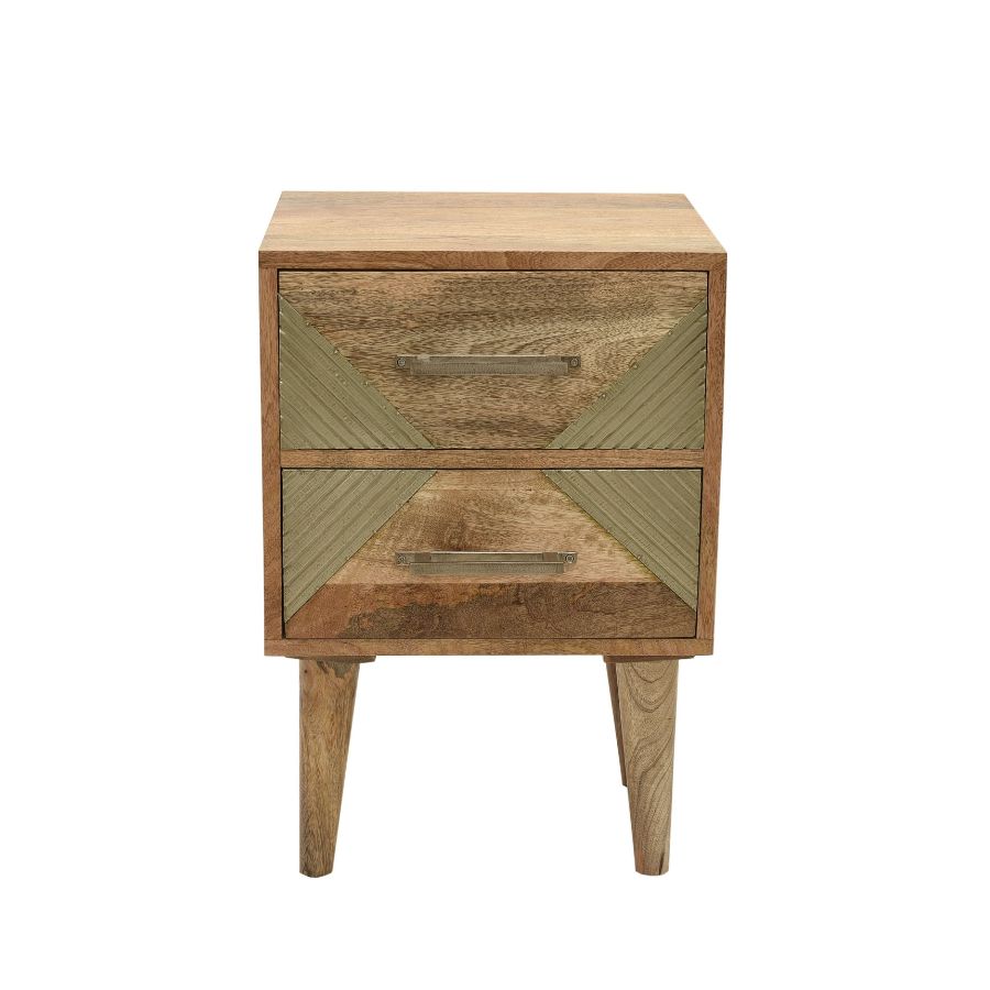 This wooden bedside table features a striking geometric design accented with brass inlay detailing. The warm wood tones are beautifully contrasted by the textured brass panels on the drawer fronts, creating a modern yet artisanal look. Raised on tapered wooden legs, it offers practical storage and timeless style, making it a perfect fit for contemporary and eclectic interiors.