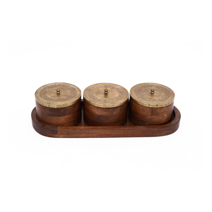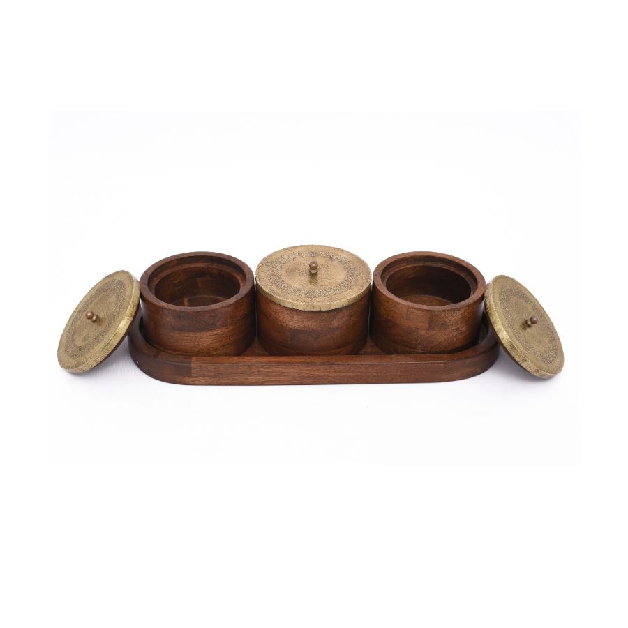 This handcrafted wooden container set includes three round jars with brass engraved lids, elegantly placed on a matching wooden tray. Each brass lid is decorated with intricate traditional patterns, giving the set a rich, vintage-inspired appeal. Functional and decorative, it is perfect for storing spices, dry fruits, condiments, or even for use as a decorative organizer.
