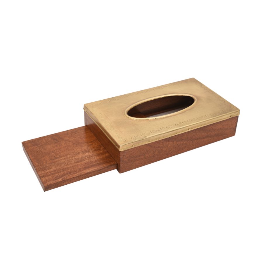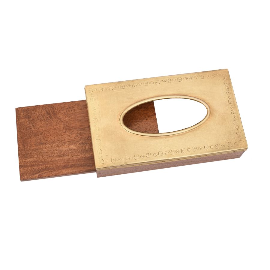 This handcrafted wooden tissue box comes with a brass sliding lid, beautifully detailed with subtle floral engraving along the edges. The unique sliding mechanism allows for easy refilling of tissues, while the combination of polished wood and antique brass finish adds a refined, traditional look. Its oval opening ensures convenient use, making it both functional and decorative.