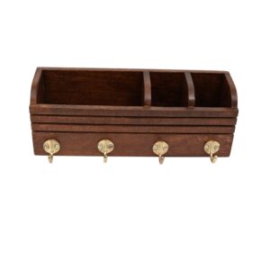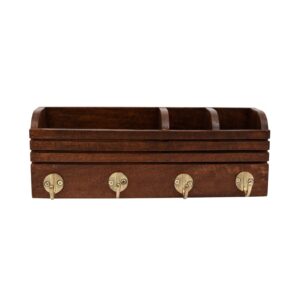 Wooden Wall Organizer with Compartments & Brass Hooks